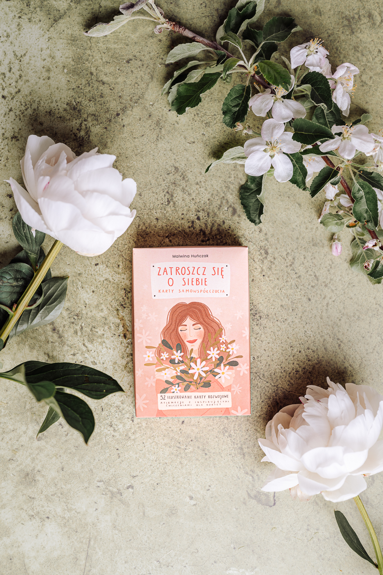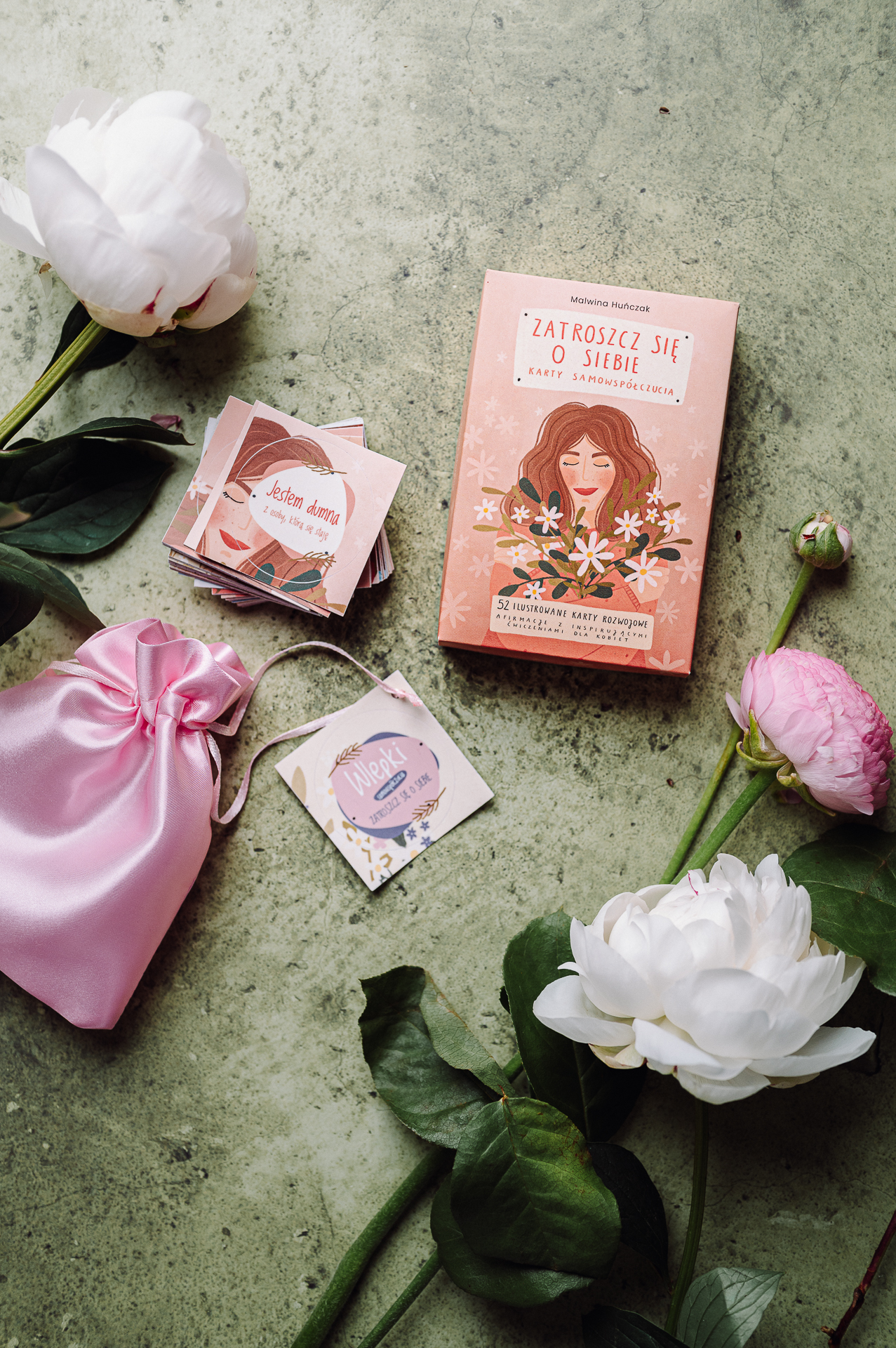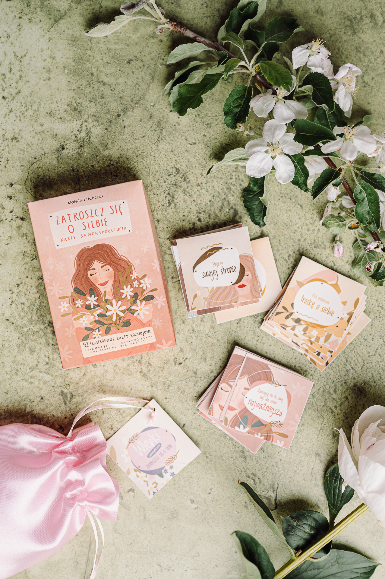 Zestaw nazwałam Zestawem Troski o Siebie, bo talia kart oraz wlepki doskonale się uzupełniają i razem stanowią jeszcze większe wsparcie, szczególnie w trudniejszych momentach życia.